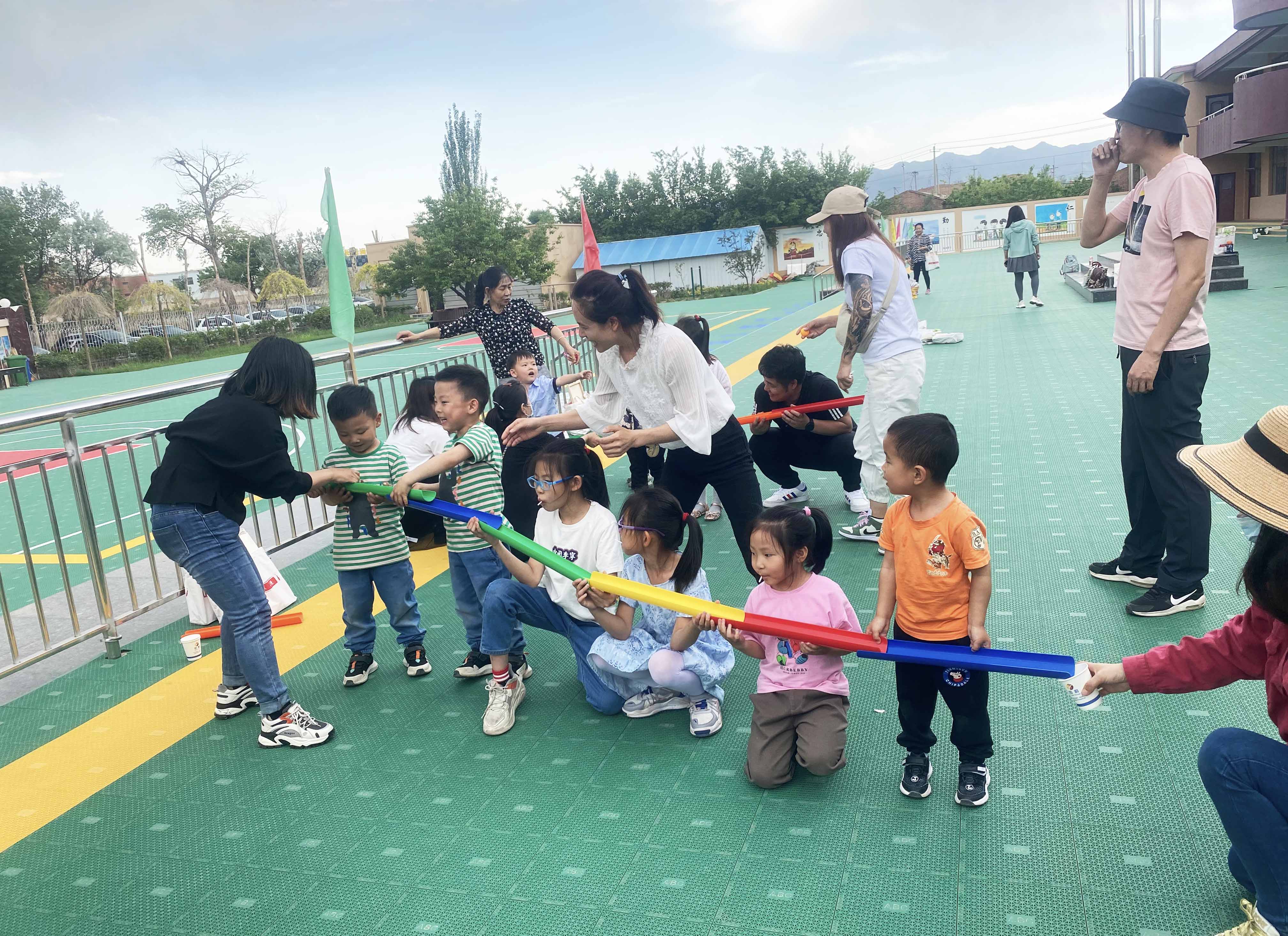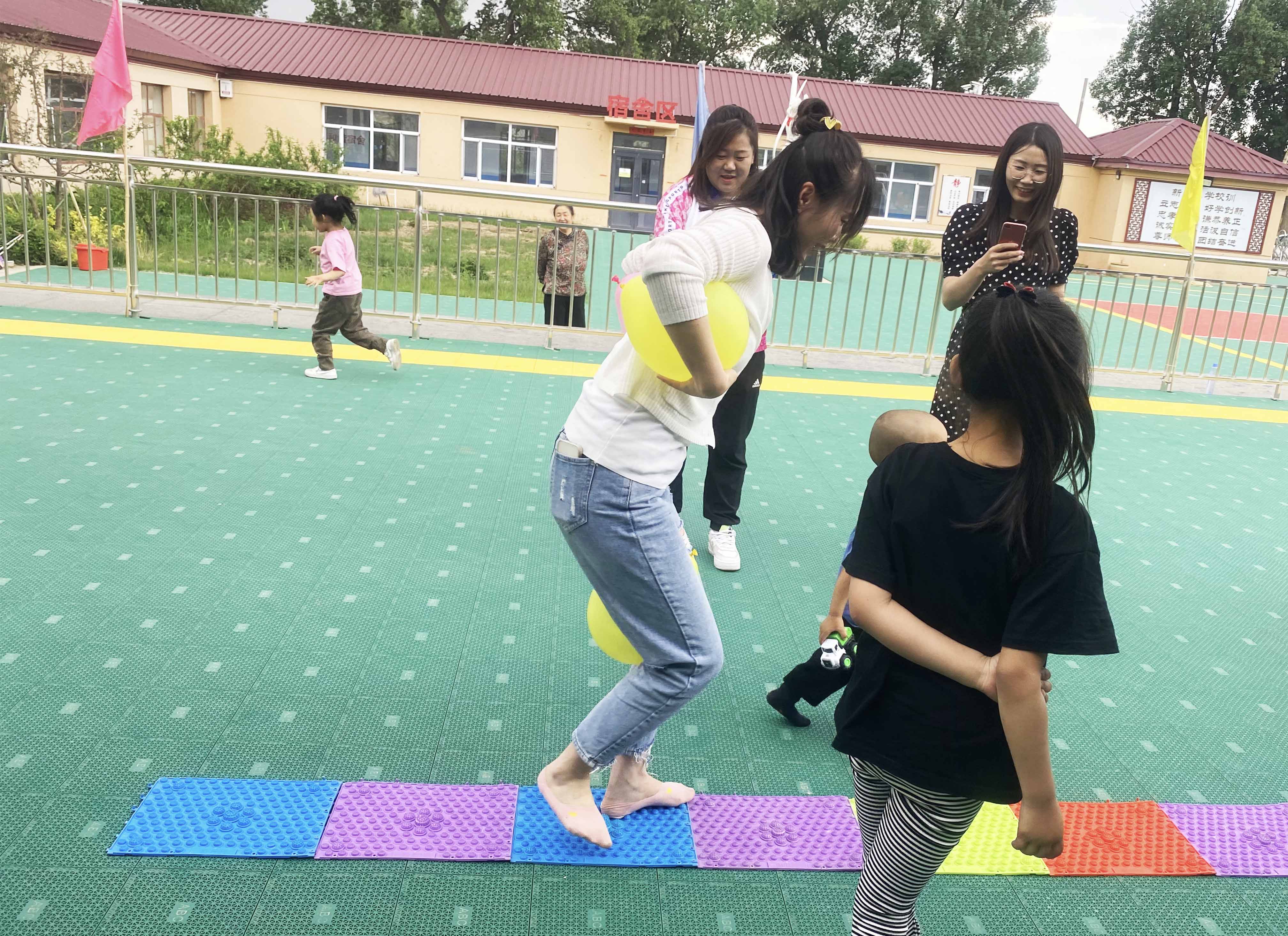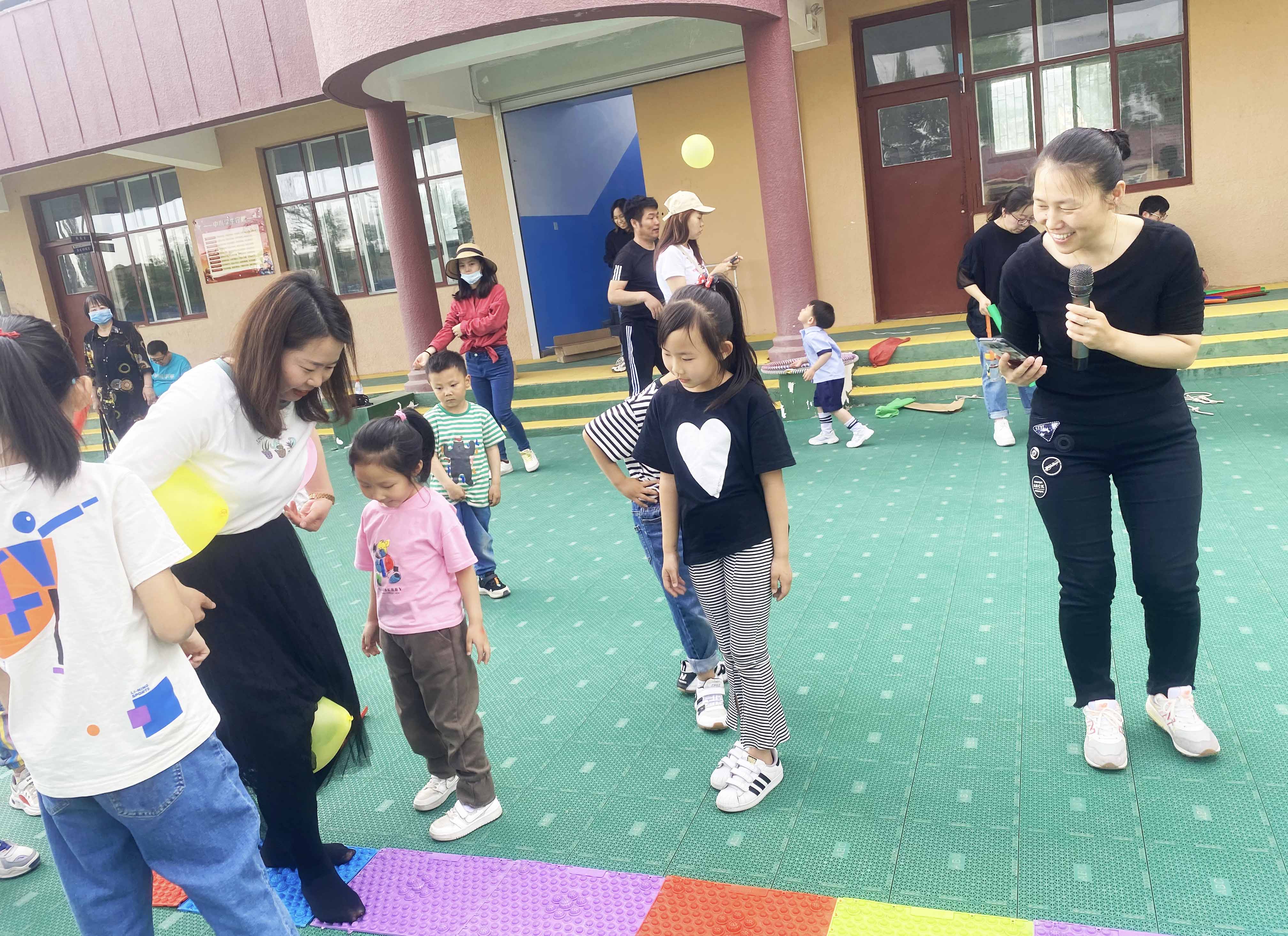 該活動分為小朋友組和家長組。游戲開始時,每個隊員牽拉同心鼓上面綁的繩子,保證鼓面水平,同時裁判將一個排球從鼓面中心上方豎直拋下,隊員齊心協力將球顛起,顛的球越多,為獲勝。 大朋友、小朋友們玩的不亦樂乎。通過三組趣味游戲,讓家長和小朋友們共同協作,完成不同的游戲任務,不僅鍛煉孩子們的團隊配合能力,隨機應變能力,還讓孩子們感受到節日的快樂。
