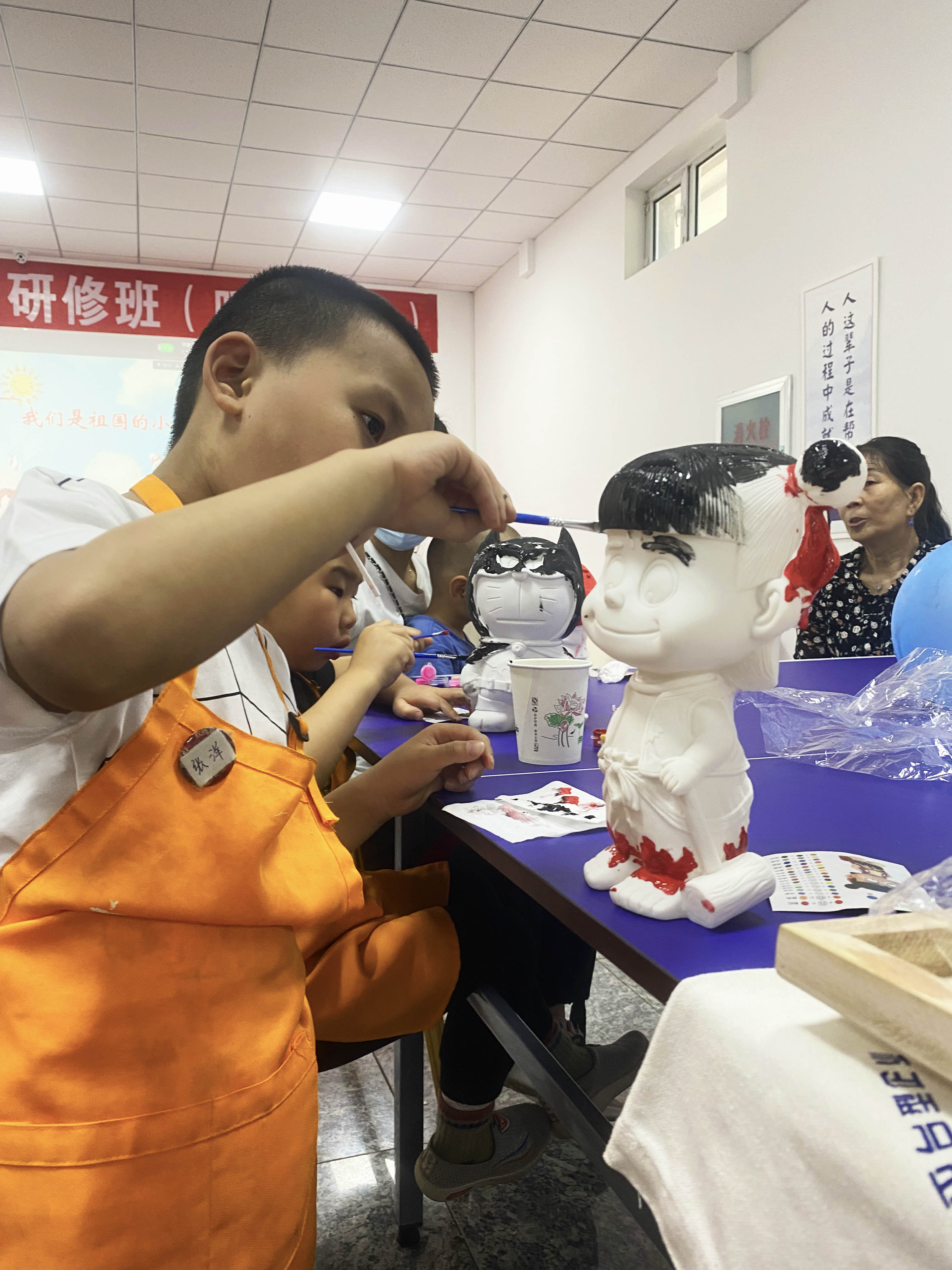 在親子手工彩繪卡通搪膠娃娃中,有哪吒、小公主、小汽車、哆啦A夢、恐龍等諸多卡通形象等著家長與小朋友的DIY彩繪,一個小時后,大家的卡通人物都已經“穿上”了五彩斑斕的花衣,大家都在做一做,畫一畫的過程中體驗了童年的樂趣。增進了孩子與家長之間的情感交流。