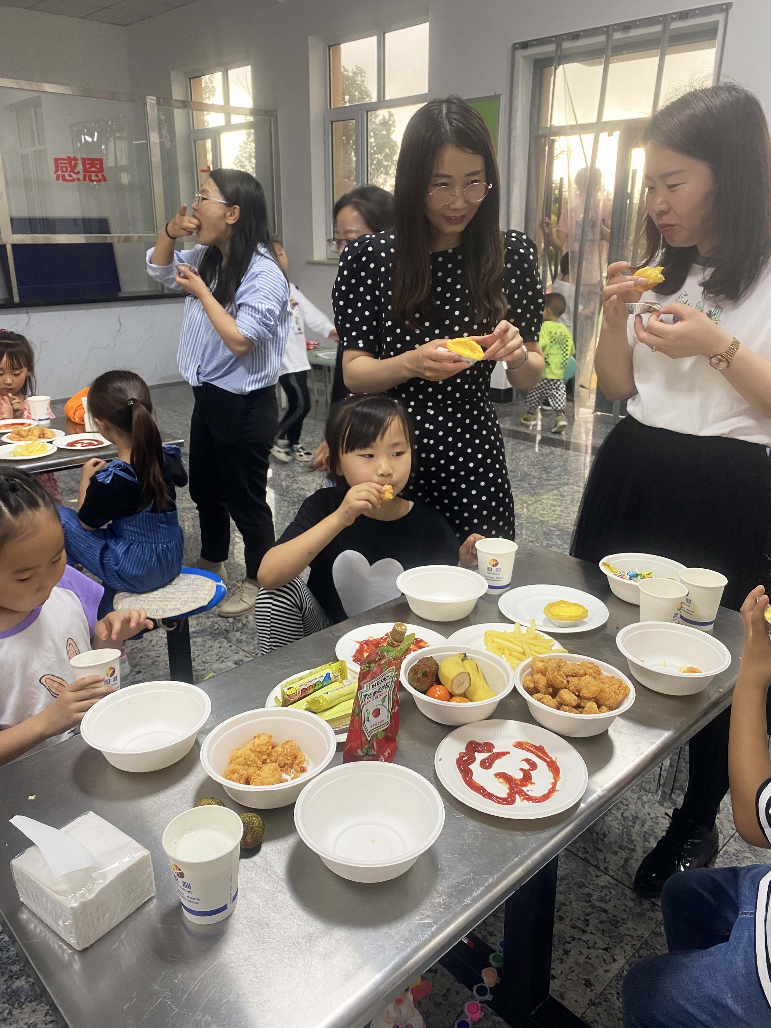 經過三個多小時的戶外運動及室內活動,為小朋友們補充能量的環節到了,家長們親自為孩子們做了薯條、蛋撻、雞米花、熱牛奶和漢堡、各類水果等兒童們最愛的美食,很快這些美食陸續裝進了小朋友們的肚子里。 有的小朋友家長沒有來,還記得走的時候要給爸爸帶上好吃的、有的要給媽媽裝蛋撻,有的要給姐姐帶漢堡包……非常感動這些有愛的小朋友的行為。這也是我們舉辦這次活動的最主要的目的,就是要讓和利這個大家庭的溫暖可以溫暖到更多的和利家人,不僅是我們的員工,還有他們的家屬!