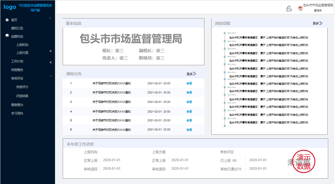 主要實現(xiàn):上報創(chuàng)建機構(gòu)、上報方案,制定工作計劃并記錄完成情況,對本單位進行自查并記錄自查整改記錄,根據(jù)下發(fā)考核任務(wù)對本單位進行評分并上傳自評報告。以及低碳節(jié)約相關(guān)學(xué)習(xí)學(xué)習(xí)資料的查閱。
